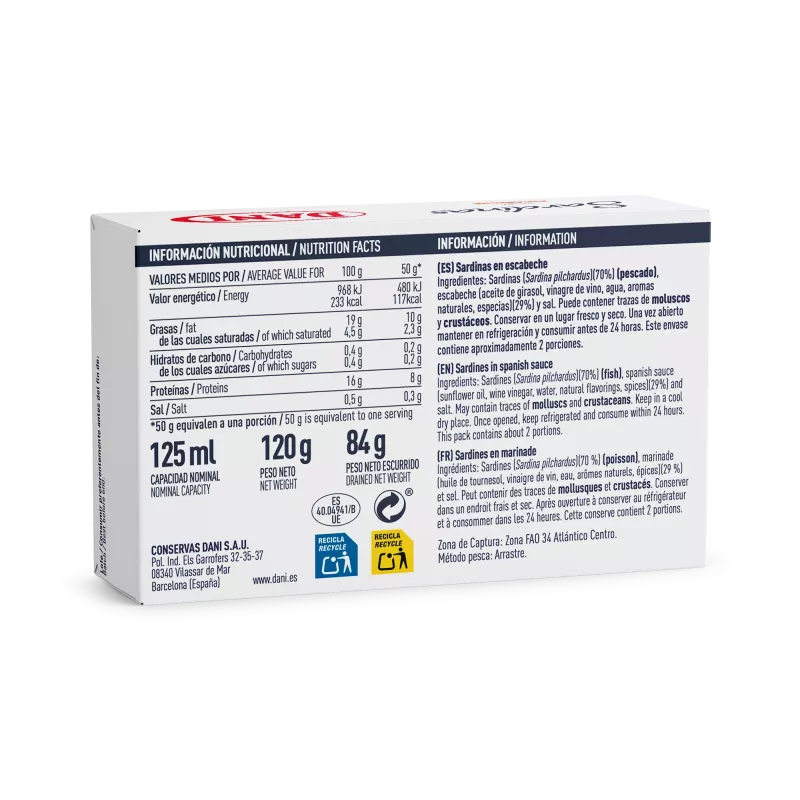 DANI sélectionne les meilleures sardinillas, coupées, décapitées et nettoyées à la main, qui sont ensuite grillées à la vapeur et mises en conserve. Notre produit est 100% méditerranéen. Ils se distinguent par leur aspect argenté attrayant, leur texture crémeuse, leur goût intense de poisson et leur magnifique présentation. Ils contribuent à la réalisation d'un régime méditerranéen grâce à leur teneur élevée en oméga-3.