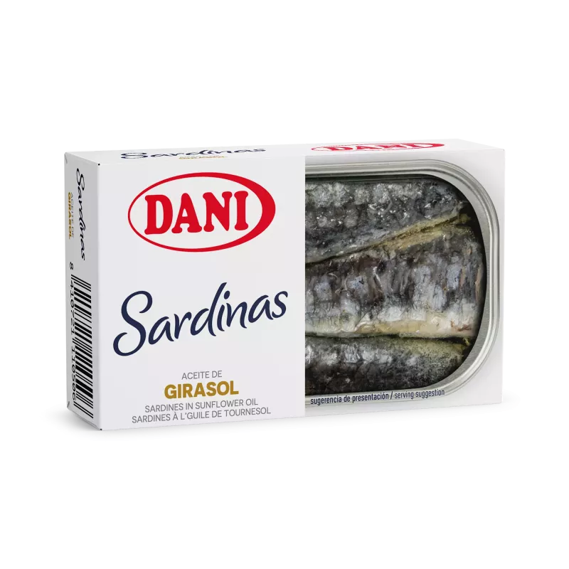 Dani selecciona as melhores sardinhas, cortadas, decapitadas e limpas à mão. Destacam-se pelo seu atraente aspeto prateado, textura cremosa, sabor intenso a peixe e magnífica apresentação. Este peixe gordo é rico em ácidos gordos Omega-3.